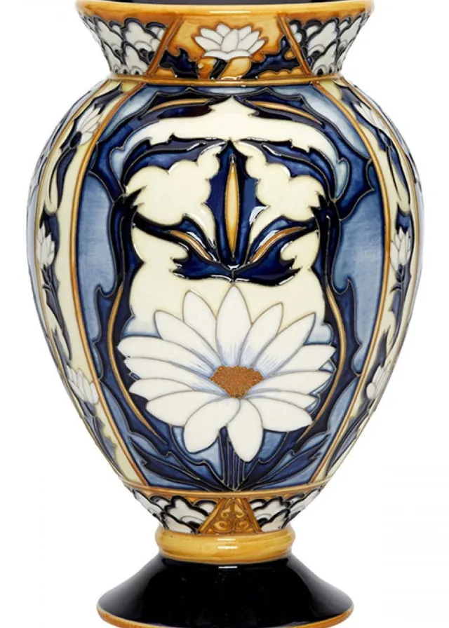 Glimpses of William Moorcroft’s gifts as an art potter, first appeared through his unusual gilded Aurelian Ware. These inaugural designs, inspired by the Japanese Imari palette, were transfer printed with enamelled decoration in vibrant reds, blues and gold. Unmistakable and not transfer-printed, Aurelian Ware regenerates with a spectacular daisy in full bloom with brilliant white petals that calmly glide out of the roundel like billowed sails, and comes complete with a blue and white Victorian geometric design on its base and rim. With a nostalgic nod to the past, Aurelian Reborn showcases a new age of artistry.