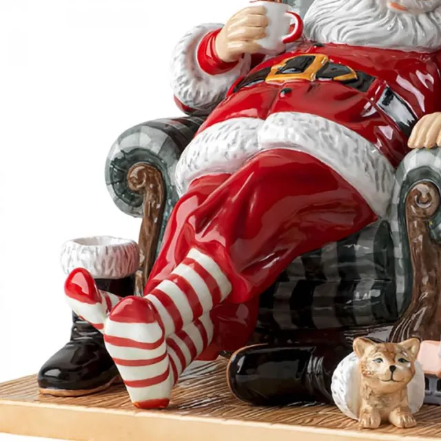 After all his hard work during the festive period, find Santa relaxing with his black leather boots kicked off, holding a hot drink in this Father Christmas 2021 Figurine. Dressed in his trademark red suit with white fur trim and matching striped socks, his rosy cheeks glow just as much as his golden belt buckle. Joined by some cute and cuddly friends, along with a sack of handmade wooden toys and beautifully wrapped gifts, ‘Santa’s Restful Moment’ is a magical Christmas scene.