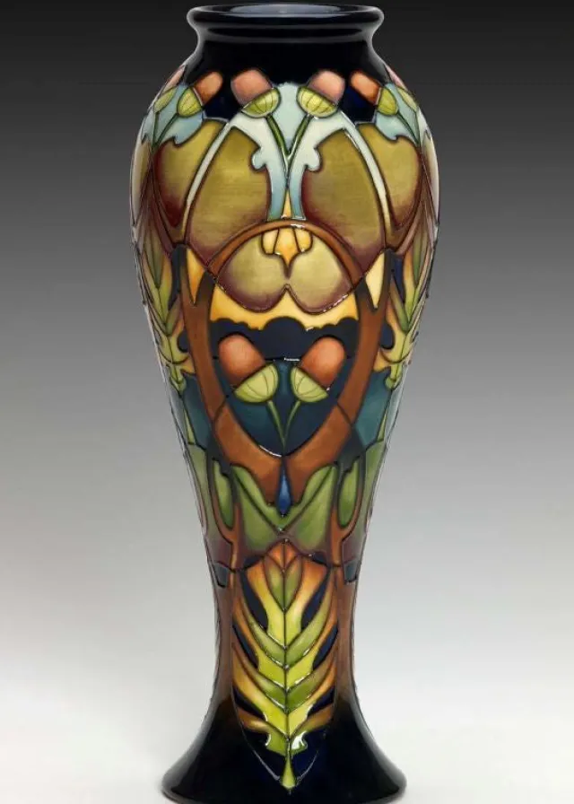 Symbolic of a nation’s strength from time immemorial, the oak tree has become a lasting feature of longevity, folklore, music, art and song. In its powerful way, it has woven that strength into most of our homes in one way or another whilst stories of Sherwood Forest pass down from generation to generation. The oak tree brings the past into the present and pulls the present into the future. Moorcroft designer, Vicky Lovatt, seized her opportunity and crafted Oaktree, a structured design in an amazingly contemporary Florian style worthy indeed of Moorcroft’s founding father, William, but with colours as soft, gentle and autumnal as befits the twenty first century. The tree branches reach upwards in an embracing loop to grasp a pair of oak apples complete with cups before swinging away around the rim of the vase with more oak apples and simple leaves. Oaktree is Moorcroft art at its very best.