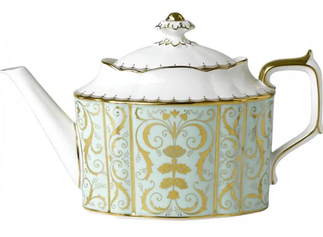 The Darley Abbey Tableware range is an an interpretation of an historical eighteenth century Regency style pattern, Darley Abbey captures the style of restrained simplicity using delicate lines and intricate curves representing twirling foliage and filigree leaves combined with 22 carat gold on a soft green silk damask background.