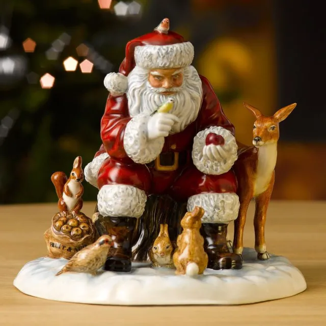 This festive figure, Santa’s Workshop shows Santa, with flowing white hair and beard, his familiar red suit and fur-trimmed boots, hard at work. Sitting at his tool bench, with paint brush in hand, he lovingly adds finishing touches to a toy train. The doll and teddy bear will be put to his sack while his Santa hat lies ready for making deliveries this busy Christmas night.”