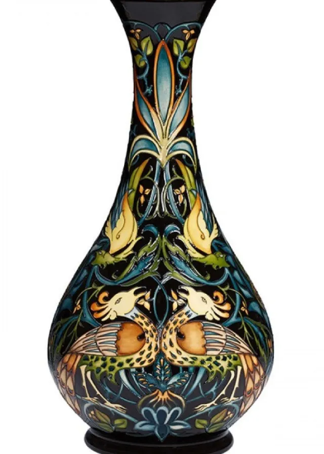 Morris believed that everybody has the right to a beautiful house, and also that the objects within it should be beautiful. Peacocks & Dragons by Nicola was inspired by the fabric adorning an armchair at Kelmscott Manor which featured peacocks and dragons. Her creation transports the incredible, interwoven detail of a Kelmscott fabric with symmetrical ribbons of foliage and mythical beasts so it comes alive into the world of Moorcroft pottery.
