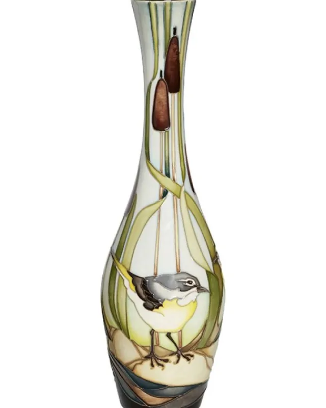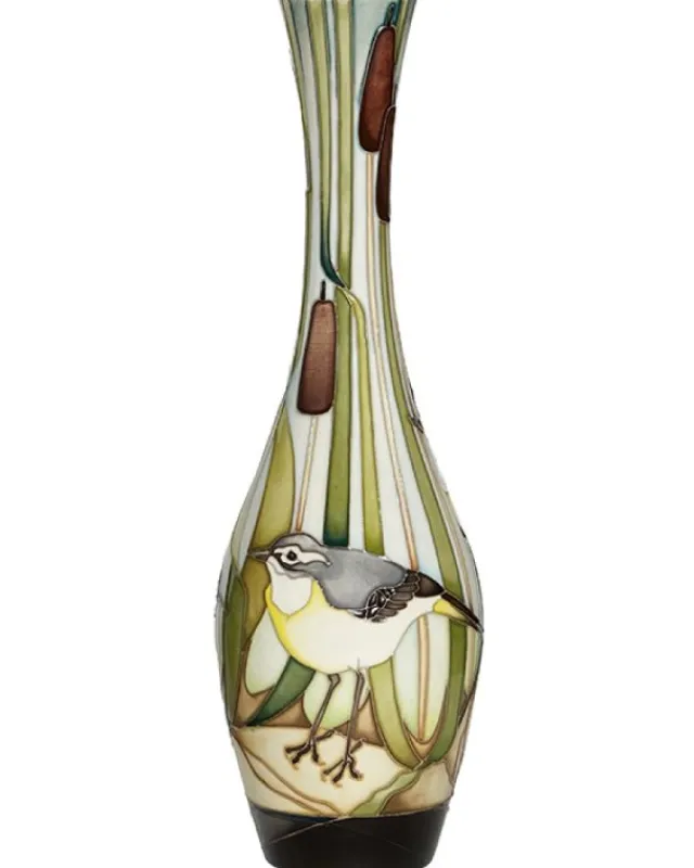 With three unique panels, the grey wagtail is explored by designer Vicky Lovatt as it flitters about the reed beds. In truth, the bird is more colourful than its name suggests, with slate grey upper parts and distinctive lemon-yellow under-tail which, in good light, appears to reflect the stylised lime-yellow bull rush stems which soar vertically to create a protective shelter. The dainty bird works in stark contrast to the reeds’ more sombre fawn to deep chocolate-coloured cylindrical flower spikes at the water’s edge, with their splashes of extravagant golden-yellow.