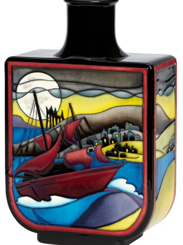 In true Gothic style, Vicky captures the atmospheric occasion on a sailor’s flagon. Under a Hunter’s Moon, a red oak-framed galleon ship is lifted high on the crashing waves as the silhouette of the ancient Abbey stands ominously over the sleepy fishing village. On the reverse of the flagon, elongated shadows of serrated wings mimic the towering silhouettes of the Abbey – whispers of a casket being opened, revelations from a ship’s log, and a mysterious dog soaring up the 99-steps to the Abbey, announces the arrival of Dracula himself perhaps?