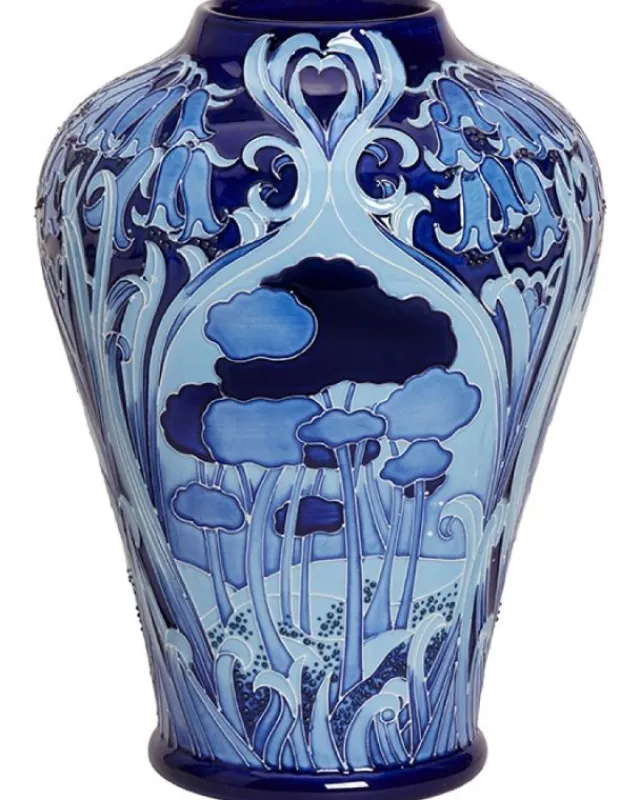 To capture this experience, Paul cleverly champions the Moorcroft blue engobe technique, where a blue clay is used before decoration commences. The Colour Blue sees clouds of ancient woodland erupt into shades of blue with bluebells delicately dotted as far as the eye can see. Draped under the rim of the vase, swathes of bluebells tower over the trees as if the trees are a mere reflection of an endless pool of blue shadows.