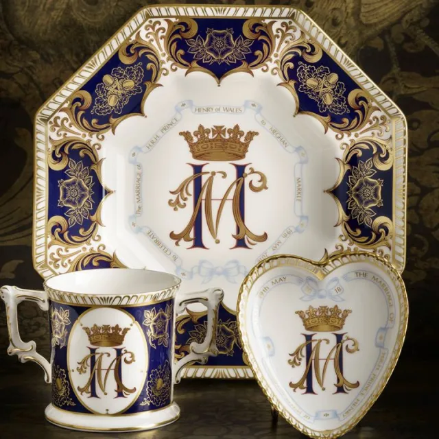 Featuring a stunning design in rich cobalt blue and 22-carat gold creating a wonderful regal feel to the luxury fine bone china Loving Cup. The front design depicts elements used on the Royal Wedding Plate including acorns representing the House of Windsor and longevity and Tudor roses representing the Royal badge of England as well as the rose being the national flower of England with the intertwining initials of Prince Harry and Meghan creating a breath-taking central motif, which complements the inscription on the back of the Loving Cup, ‘H.R.H Prince Henry of Wales to Meghan Markle ~ 19th May 2018’ perfectly.