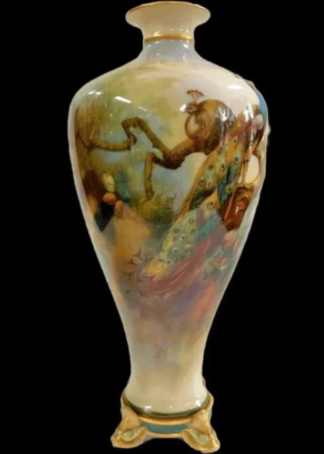 A exceptional tall Royal Worcester Peacocks footed baluster vase with a flared rim!