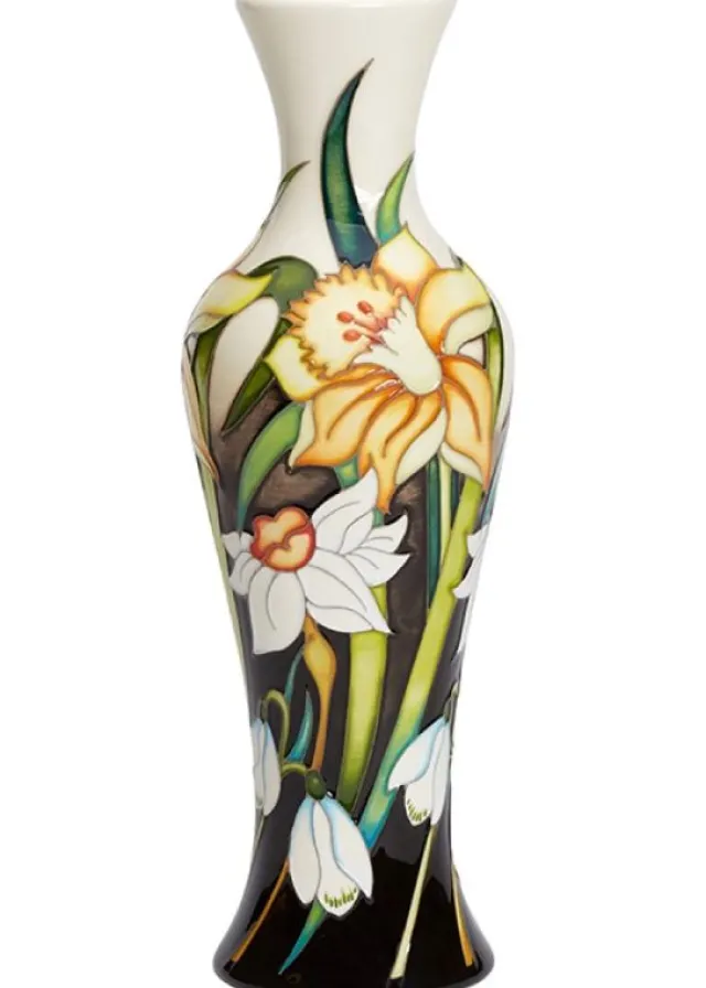 Her choice of the elegant 93/10 shape helped bring subtle beauty to the image with snowflakes lowering their heads as if in homage to what grew above them; her two narcissus flower heads were allowed to keep their ivory white petals and soft golden trumpet centres – all designed to transform the original watercolour into an astonishingly attractive work of ceramic art.